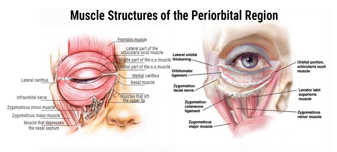 The periorbital area is the area around the eyes, consisting of the upper and lower eyelids, the lacrimal apparatus, the palpebral fissure, and the conjunctival sac. This area is one of the most delicate and complex areas of the face, requiring particularly careful and professional care.