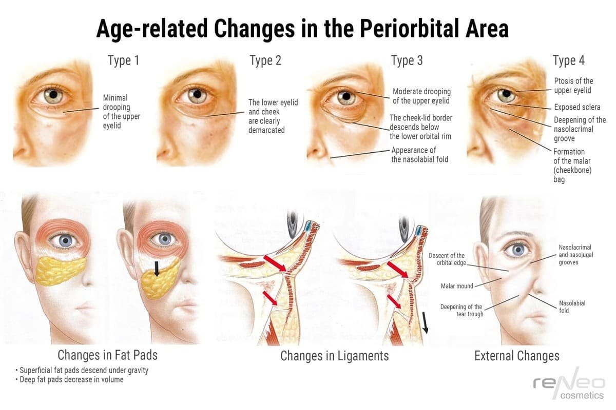 - Reduction in the volume of adipose tissue and restructuring of the deep structures of the periorbital area with age.