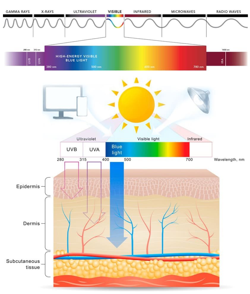 Blue light is part of the visible spectrum and refers to HEV radiation (High Energy Visible Light). The wavelength is 380-500 nanometers (nm). Its source is primarily the sun. In addition, carriers of blue light are LED lamps, flashlights, screens of smartphones, computers, TVs, xenon and energy-saving lamps and any other artificial sources. That is, blue light is almost all the light we see. Even the sky is blue precisely because blue light makes it so. HEV radiation is an important part of human life. Blue light is necessary to regulate the circadian rhythm because it stimulates melanopsin (light-sensitive protein) receptors in the eyes. This suppresses daytime melatonin, which ensures wakefulness during the day and sleep at night when the melatonin hormone levels are higher. Melatonin is responsible for the quality of sleep, functioning of all body processes and appearance. Blue light, which we receive together with solar radiation, is necessary for normal growth, vision, well-being and mood. Deficiency can lead to depression, apathy, etc. Blue light has anti-proliferative properties and is used for therapeutic purposes in skin diseases, including psoriasis. However, modern research has also revealed its potentially harmful effects. Studies of the effects and potential harm of blue light began relatively recently, already in the 21st century, and were initially related to the effects of radiation on the retina of the eye. The possible damage to the skin was discussed later, when scientists discovered that blue light, like UVA/UVB rays, can create reactive oxygen species in the body.