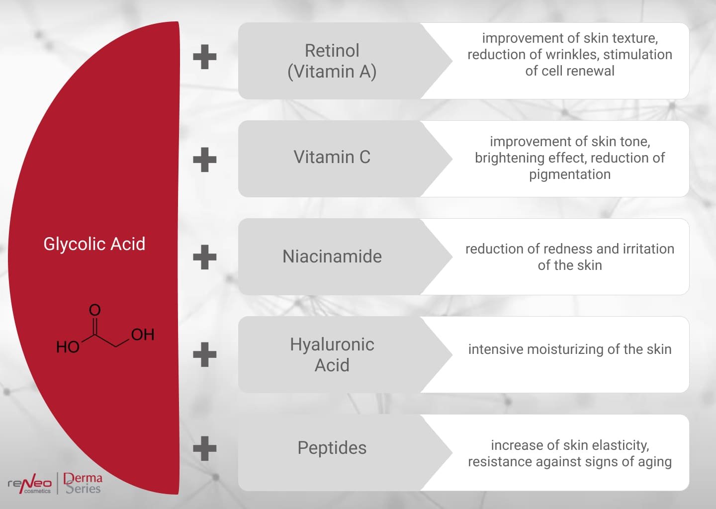 Among all AHA-acids, glycolic acid has the smallest molecule size (76.05 g/mol), which allows it to penetrate into the deep layers of the epidermis. Glycolic acid is successfully used in many cosmetology products due to its multifunctional effect: