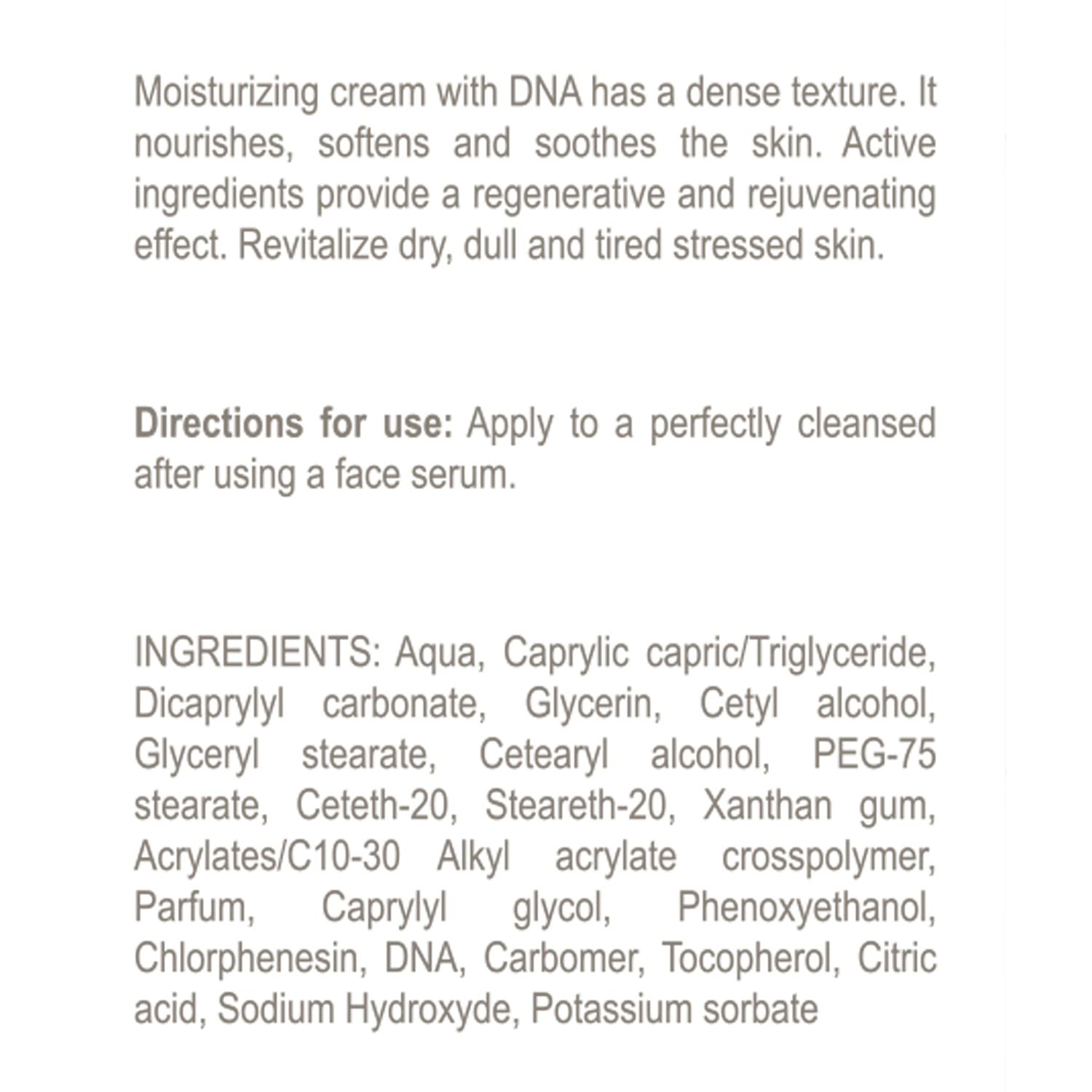 INCI: Aqua, Caprylic capric/Triglyceride, Dicaprylyl carbonate, Glycerin, Cetyl alcohol, Glyceryl stearate, Cetearyl alcohol, PEG-75 stearate, Ceteth-20, Steareth-20, Xanthan gum, Acrylates/C10-30 Alkyl acrylate crosspolymer, Parfum, Caprylyl glycol, Phenoxyethanol, Chlorphenesin, DNA, Carbomer, Tocopherol, Citric acid, Sodium Hydroxyde, Potassium sorbate.
