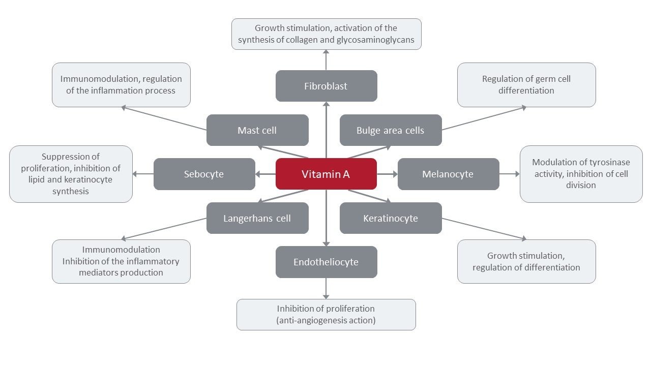 On the membrane of keratocytes and fibroblasts, there are special RAR receptors that are tropic only for retinoic acid. Other forms of retinol, due to a cascade of reactions, are able to turn into retinoic acid and give an appropriate response from skin cells, which is characteristic of vitamin A.