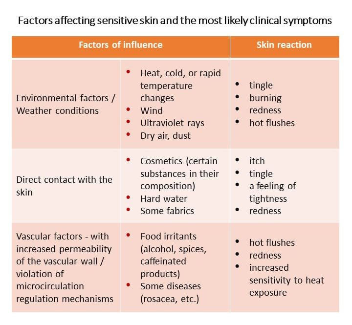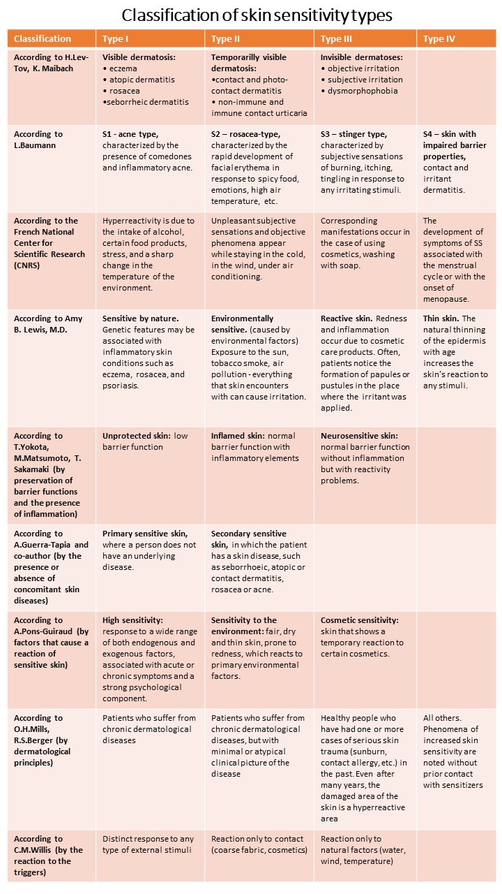 Thus, subtypes of sensitive skin can be distinguished on the basis of provoking factors, the presence of dermatological diseases, the preservation of the barrier function of the skin, the degree of skin reaction to irritants, etc.
